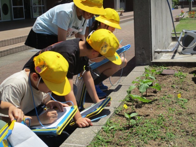 育てている植物の、芽が出た頃との違いを意識して観察しました。葉の色や形、大きさ、数等の観察ポイントを基に、調べたり記録したりして生長を感じていました。