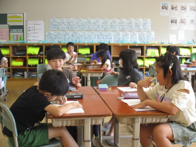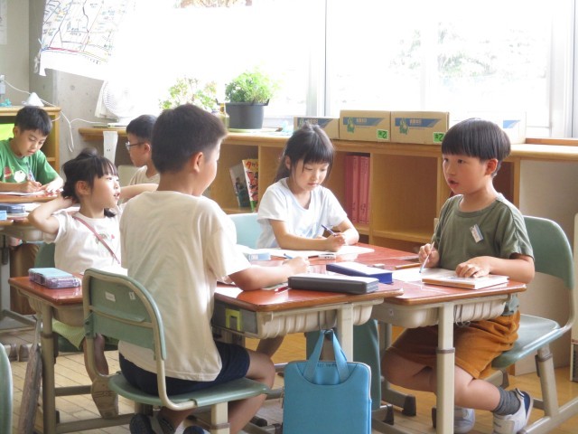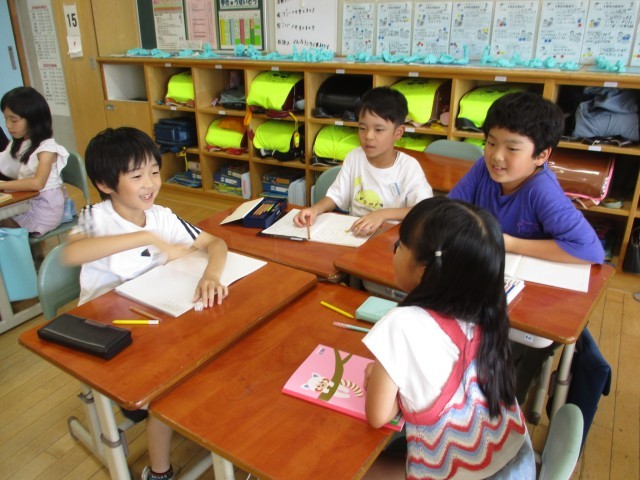 メモをするときに気を付けることを学習した後、メモをとる活動を行いました。グループで順番に、質問しながらメモをとる側、質問に詳しく答える側に分かれて行いました。繰り返す内に、「メモに慣れてきた。町探検で生かせそう」「たくさん質問したから、メモをすると言われたことが分かる」など、メモのよさを実感する声が聞かれました。