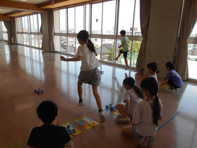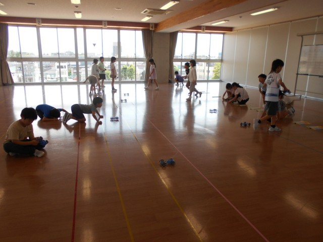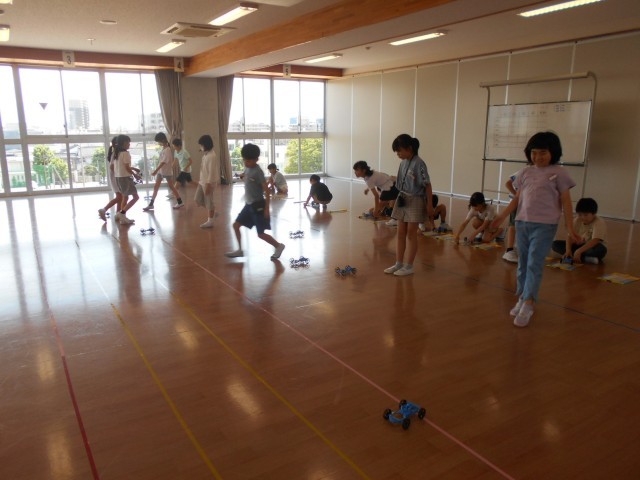 ゴムの働きについて学んだことを生かして、車を決まった場所に止めるゲームをしました。車の走る距離を見て、ゴムの長さの調節することを繰り返しながら、ねらい通りに車を止める難しさを感じていました。