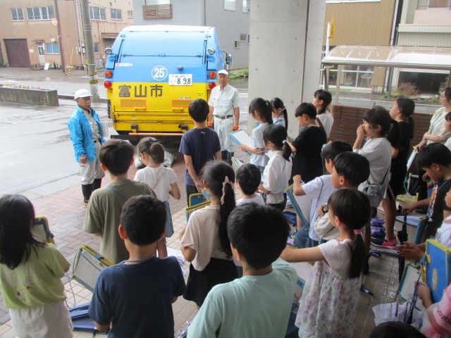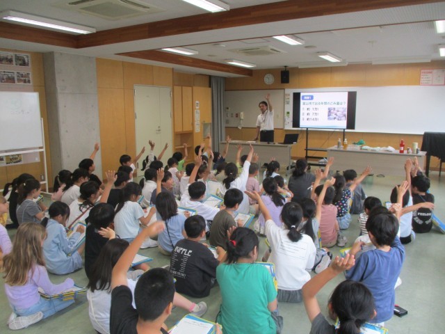 今日は社会科の学習の一環で、廃棄物対策課からいらっしゃった講師の方々による3Rスクールが行われ、ごみを減らす3Rの取組やゴミ収集車の仕組みについて学びました。ごみをリサイクルしてつくられる物を実際に見たり触ったりする体験や、ゴミ収集車の仕組みを実際に動く様子から見て学ぶ活動の中で、「捨てたごみってこんなに使われているんだ!」「こうやってごみって集められているんだ!」と驚いている姿や、講師の方々に積極的にインタビューをしに行く姿が見られました。