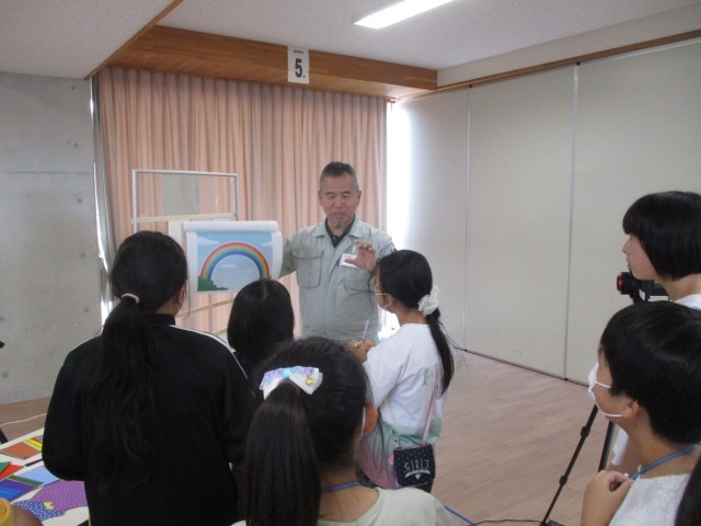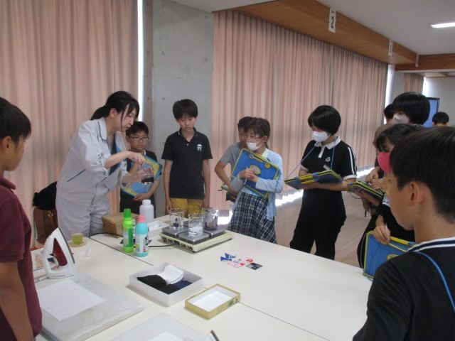 富山県産業技術研究開発センターの方に来ていただき、衣服の繊維による違いを調べました。保温性や通気性、乾きやすさなどを布ごとに比べました。いろいろな装置を使って教えていただき、子供たちも実験を楽しんでいました。