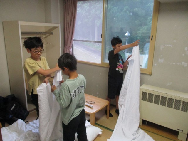朝の支度も素早くできました。友達と協力してシーツや布団もたたみました。