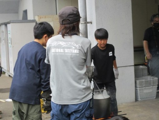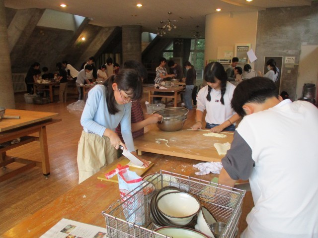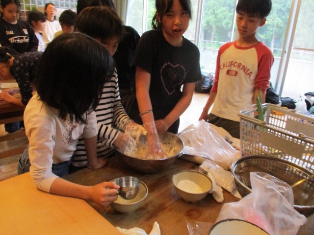 うどんを粉から作りました。水を慎重に入れたり、一生懸命こねたりしました。足で踏んで薄くし、自分たちの好みの太さになるように切りました。外ではかまど係が一生懸命火が消えないように薪を入れました。自分たちで作ったうどんはとてもおいしかったようです。