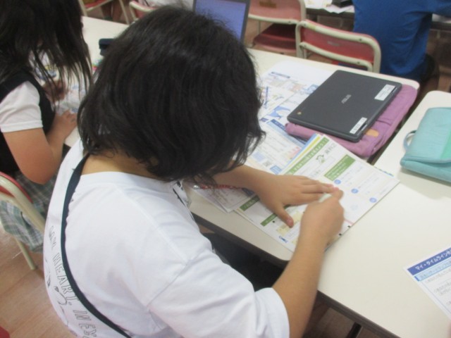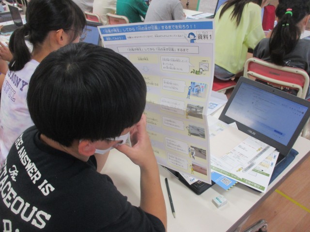 2日目の防災講座では、台風や大雨による洪水に備えるための「マイタイムライン」を作成しました。「自分の家族構成だったら」、「自分の家の場所だったら」と自分事に考え、何を、いつすればよいのかを具体的に考えました。友達の考えを聞きながら、家庭ごとに最適な行動が違うことを理解し合い、「命を守る」ことについて視点を広げていました。