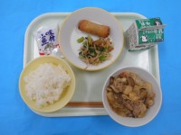 きょうのメニューは、ごはん、ぎゅうにゅう、はっぽうさい、こうみあえ、はるまき、あ...