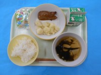 きょうのメニューは、ごはん、ぎゅうにゅう、わかたけじる、こふきいも、こいのぼり...