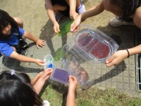 透明な廃材に、マジックで色を付けたり色水を入れたりしました。天気もよく、日光で...