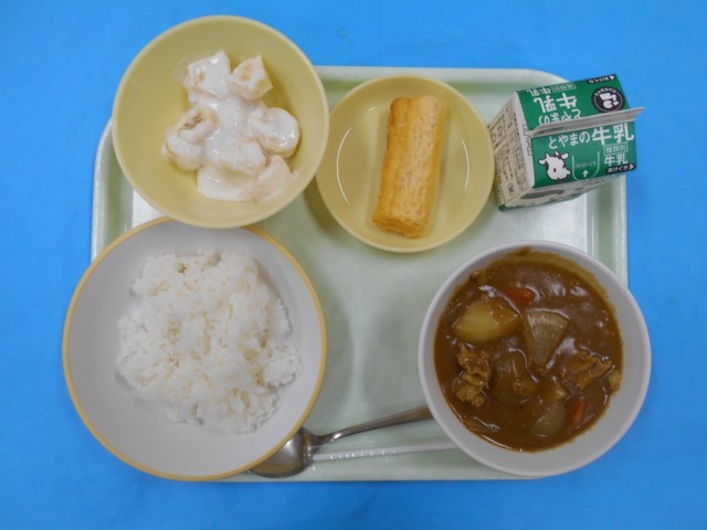 このひのきゅうしょくは、ごはん、カレー、ぎゅうにゅう、たまごロール、...