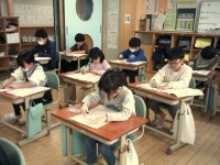 冬休み前、最後の書初め練習を行いました。立って書く子、座って書く子、思い思いに...