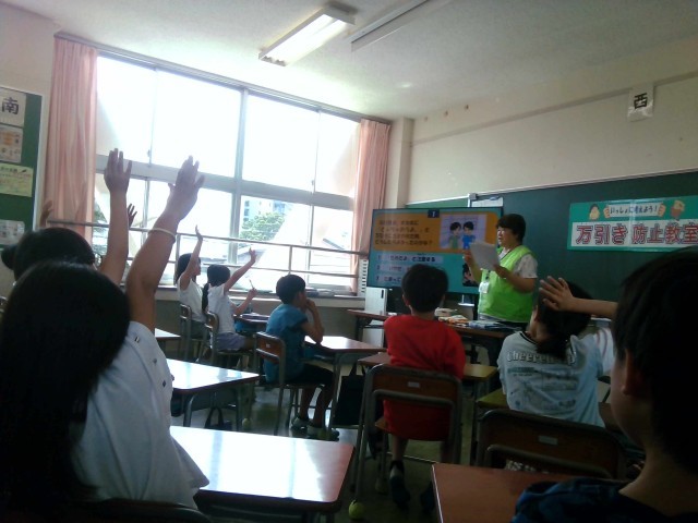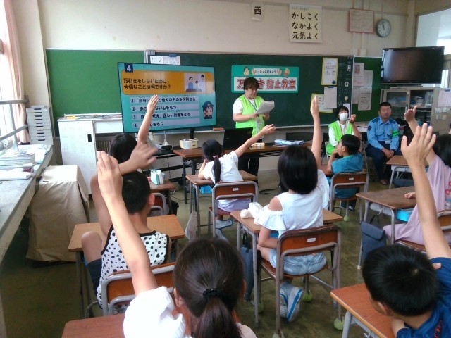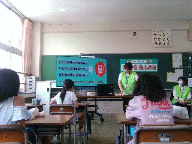 校下の青少年補導育成会と警察署から4名の方が来校され、万引きについて詳しくお話してくださいました。犯罪をしないためには、①人のものと自分のものを区別すること②自分で考えて行動すること③強い心をもつことが大事だと教えてもらいました。