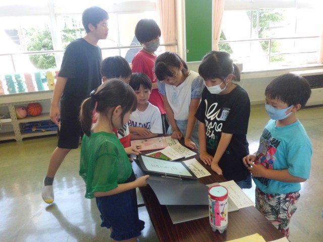 きょうのにこにこタイムは、夏休みの自由研究等の取組をなかよし班のみんなで鑑賞しました。がんばったところや工夫したことを伝え合いました。