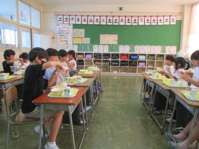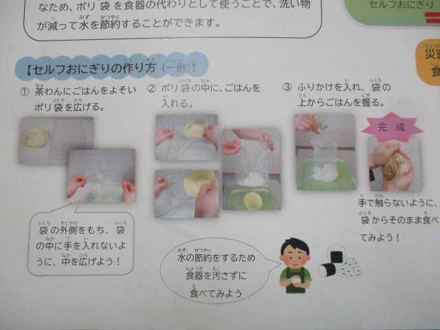 今日の給食は、防災の日献立でした。①火を使わずに食べることができる②水を節約して、衛生的に食べる③長期保存ができる食材を使うなどのポイントが挙げられています。子供たちは、セルフおにぎりを実際に作って食べました。