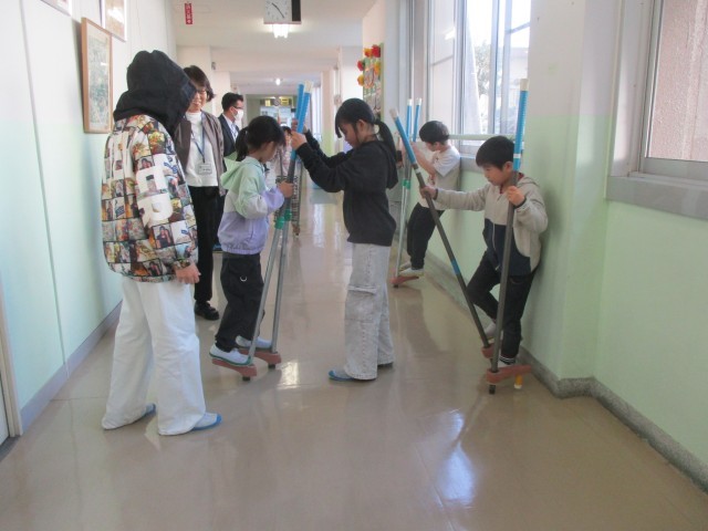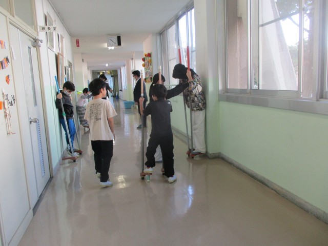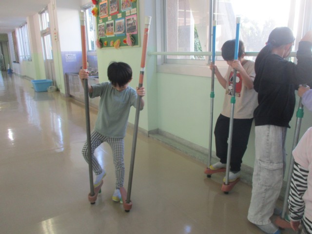サンサンタイム、竹馬に挑戦している子供たちがいました。2年生はまず乗ることに悪戦苦闘していました。6年生や先生に教えてもらいながら、一生懸命に練習していました。