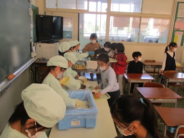 給食を楽しみにしている2年生。当番もてきぱきこなします。もちろん、モリモリ食べて元気いっぱいです。