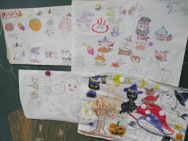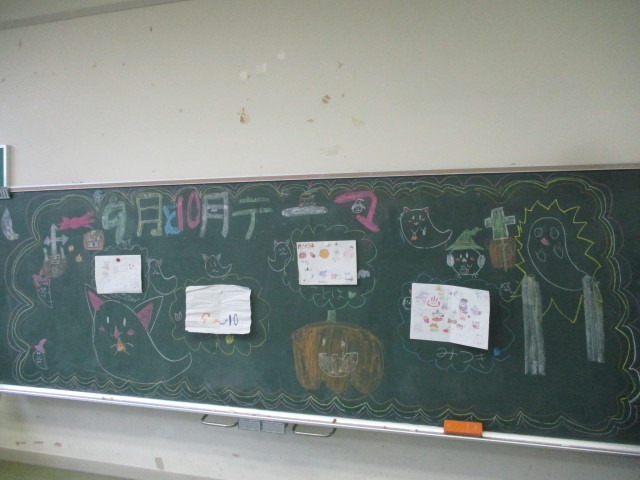 イラスト係がハロウィンを楽しむイラストで黒板を飾ってくれました。