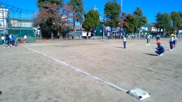 秋晴れの校庭で、試合をしました。バットで打つ、ボールを投げる・捕るが上手になりました。