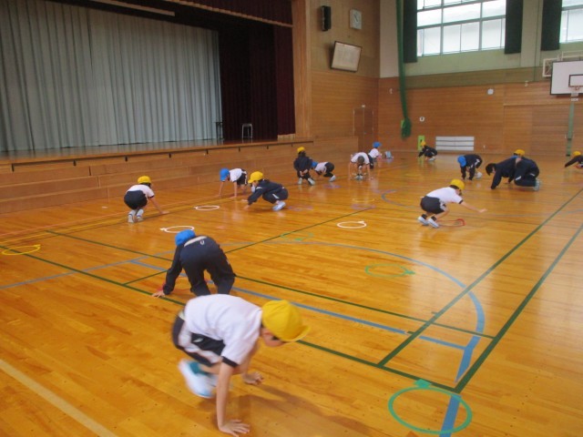 両足踏み切りや手を着く位置等に気を付けて、開脚跳びの練習をしました。「友達に教えてもらったらできた。」など、学習の振り返りを伝えてくれる子供がいました。3年生と4年生で協力して、活動を進めています。