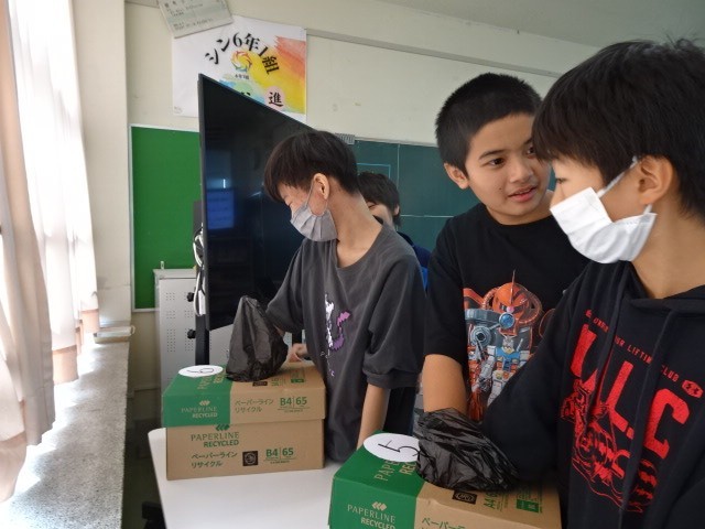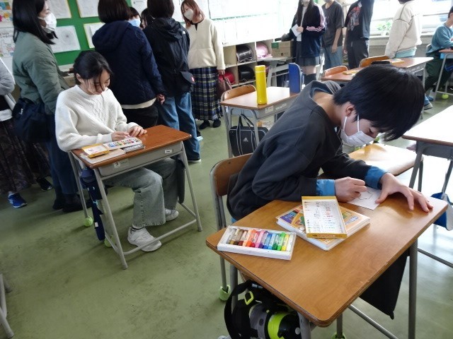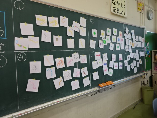 学習参観では、図画工作科の学習で触覚を頼りに箱の中身を想像して絵に表しました。