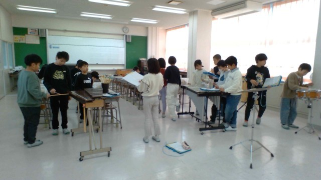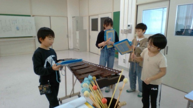 皮が張ってある、金属でできている、木でできている三種類の打楽器の音の特徴を調べています。これから、4年1組の音楽をつくっていきます。