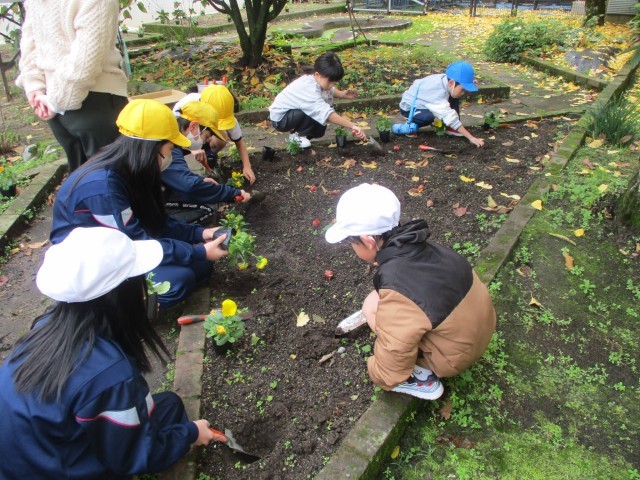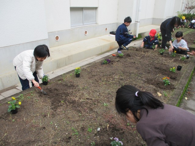 中庭の花壇に、ビオラ・パンジーの苗やチューリップの球根を植えるお手伝いをしました。参加した3年生は、「青色がいいな。」など苗を選んで植えていました。