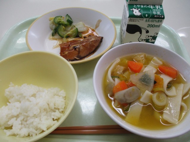 今日は、冬至ですね。給食のメニューも季節に合わせた「ほうとうなべ」「ゆず和え」でした。ほうとうには、かぼちゃが使われていて、体が温まりました。