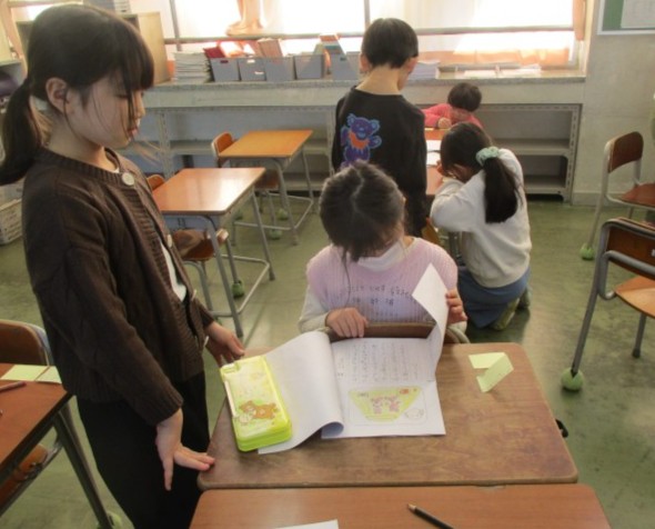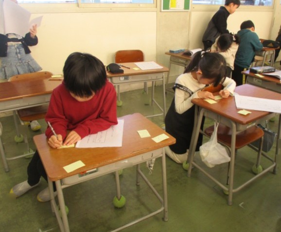 国語科の学習で、お話を書きました。用意した挿絵から想像をふくらませたり、自分で場面を考えて挿絵を増やして話を進めたりと、意欲的に取り組んでいました。書きあがったお話をみんなで読み合い、素敵なところを付箋に書いて伝えました。