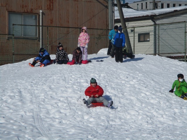 今日はよい天気の中、雪遊びを行いました。広いグラウンドを思い切り使い、思い思いに遊ぶことができました。また雪が降ったときに、もう一度できるとよいですね。