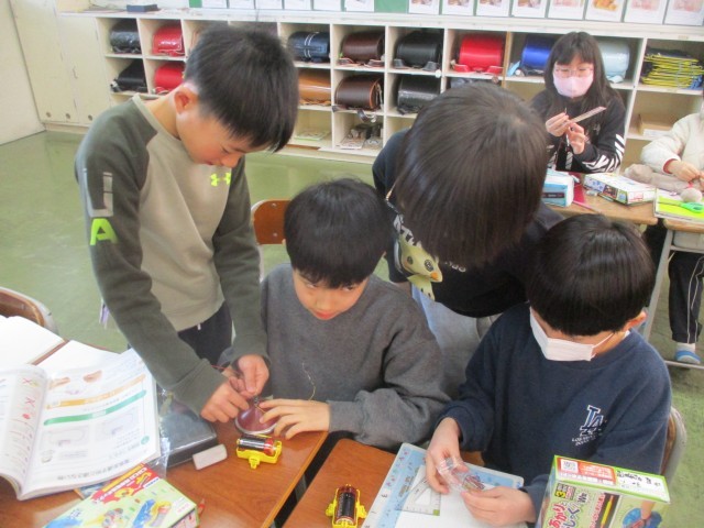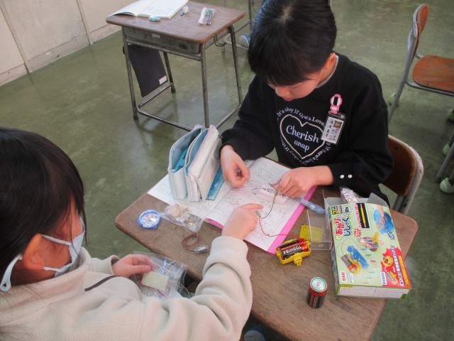どんな物が、電気を通すのか実験しました。子供たちは、自分の文房具や学習用具など、いろいろな物を回路につなげて、豆電球の明かりがつくかを調べていました。