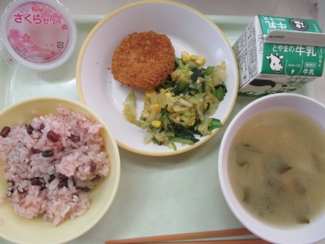 今日は、卒業祝い献立でした。メニューは、赤飯、とんかつ、コーン和え、みそ汁、さくらゼリーです。今週は、特別な献立が2回もありました。