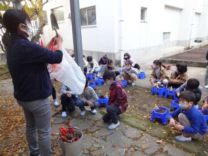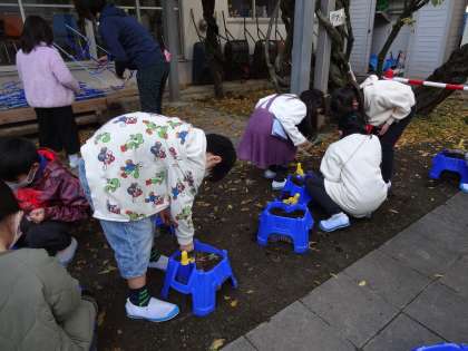 今年アサガオを植えた鉢に、チューリップの球根を植えました。何色の花が咲くのでしょうか。来年の春が楽しみです。
