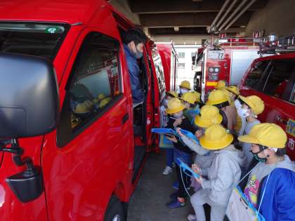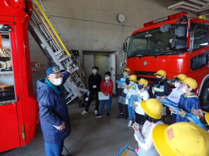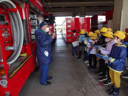 コロナ禍のため、消防署内には、入ることはできませんでしたが、様々な消防車両を見学することができました。そして、その利用方法や設備を丁寧に教えていただきました。