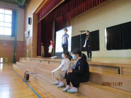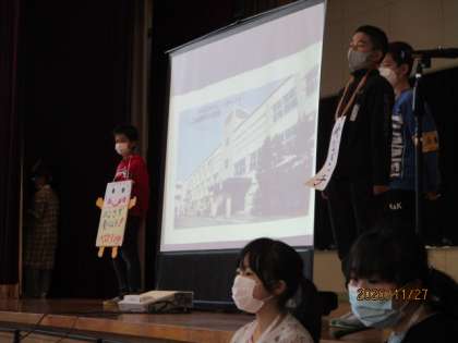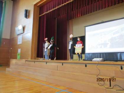 今朝のさわやか集会で、給食委員会の子供たちが発表をしました。ペロリンくん(給食委員会のキャラクター)が、コロナ感染症予防のために、丁寧に手洗いを行い、前向きで話をせずに食事することを確認したり、「富山県産の食べ物たち」が、「学校給食とやまの日」を説明して、安心・安全に学校給食が提供されていることを伝えました。