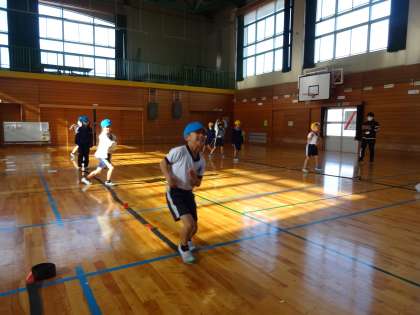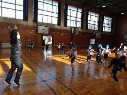 ウオーミングアップは、リズムに合わせて、ノリノリに運動しました。