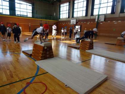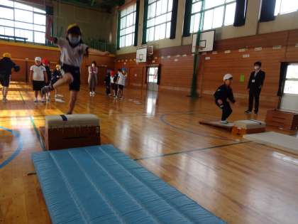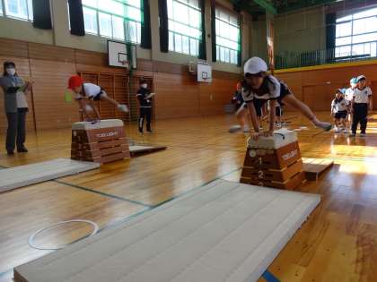 大また助走開脚跳び、ピョンピョン助走開脚跳び等、「1、2、3、4」のリズムで、繰り返し練習に励みました。技能が上達しています。