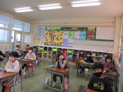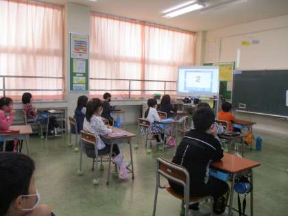 プロジェクターから映し出される、フラッシュかけ算の九九を口に出して答えました。聞こえてくる声よりも早く九九を唱えようとして集中しながら取り組みました。