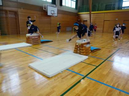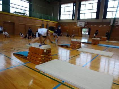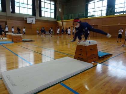 跳び箱運動の学習をしています。4段縦置きの跳び箱を全員が跳べるように練習に励んでいます。