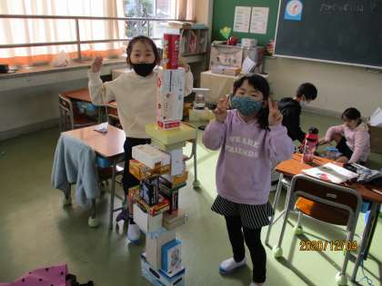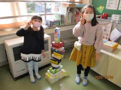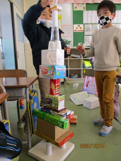 せっかく積み上げたタワーが崩れると、教室に悲しい声が響き渡りました。友達と試行錯誤しながら、高く高く積み上げることができました。