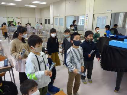 演奏者は、3年生です。交代でトーンチャイムやハンドベルやを持ち、自分の担当の音を鳴らし、「きらきらぼし」を演奏しました。