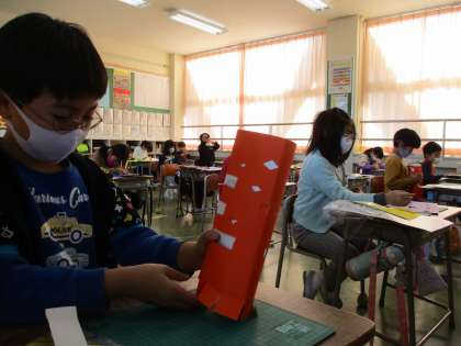 カッターをつかって不思議に思ったり、ウキウキしたりなどしたりする「おもしろハウス」を作りました。今まで学習してきたカッターの使い方を振り返り、安全に学習しました。