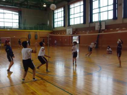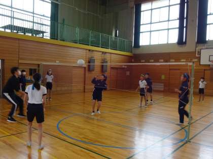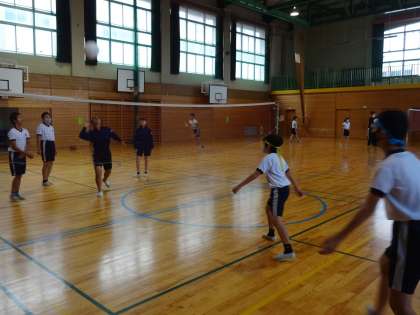 6チームに分かれて、ソフトバレーボールのリーグ戦をしています。ずいぶんラリーが続く場面も見られるようになりました。チームで協力してボールをつないでいます。
