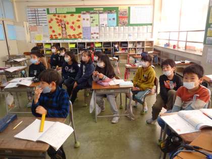 かけ算の文章問題を自作しました。発表して、みんなでその答えを求める式・答えを考えました。