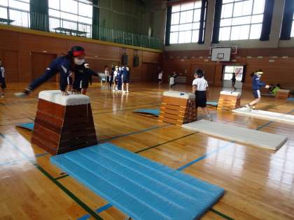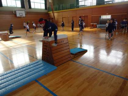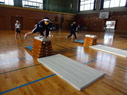 跳び箱運動の様子です。練習の成果により、技能が上達しています。