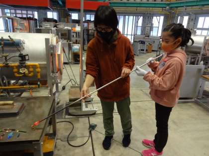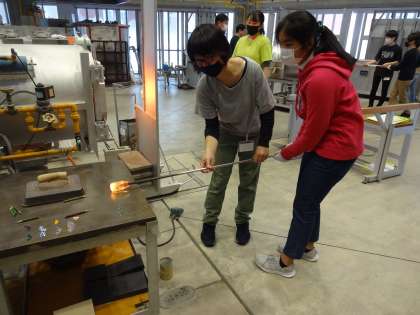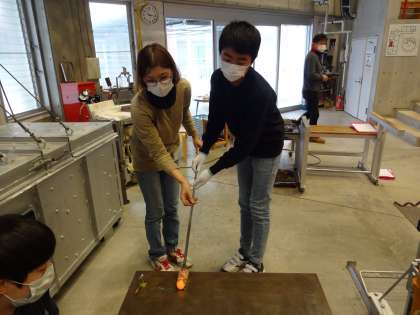 好みの色を付けるために、溶けて軟らかくなったガラスに金属(酸化物)を付けている様子です。