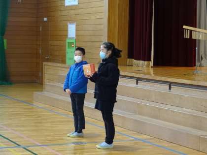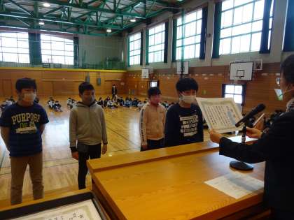 次に、受賞伝達をしました。「川の絵画コンクール 銅賞、佳作」「思考大会 優秀賞」の受賞を祝いました。