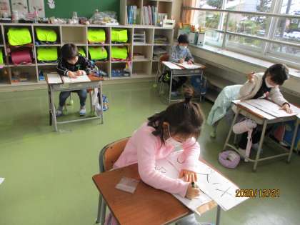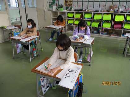 2回目の書初練習をしました。「うまく書けた」と喜んだり、「バランスがよくないな」と首をかしげたりしながら繰り返し書きました。今日は、名前も丁寧に書きました。