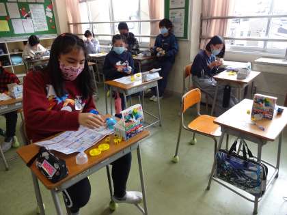 手回し発電機の回す回数によって電力の大きさは変わるか、豆電球と発光ダイオードでは、どちらが長く光を放つのかなど、一人一人が実験器具を使って実験しました。