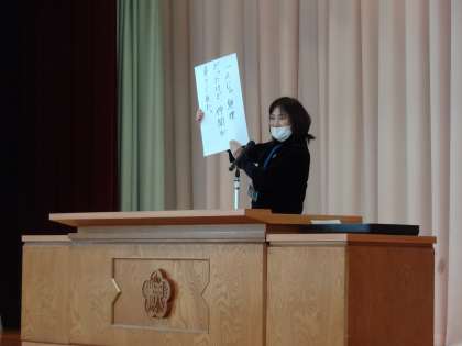 スマイル級担任の先生の離任式を行いました。児童代表が、感謝の言葉を述べ、花束を渡しました。本当にお世話になりました。ありがとうございました。