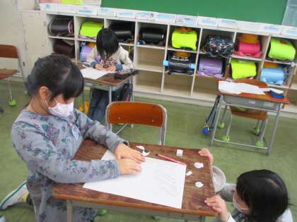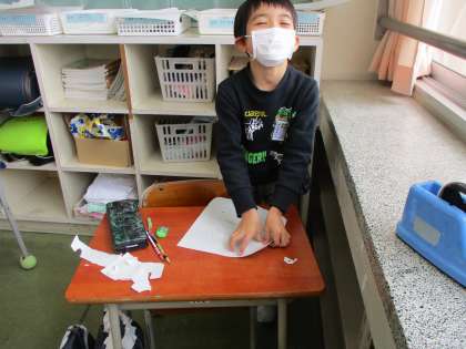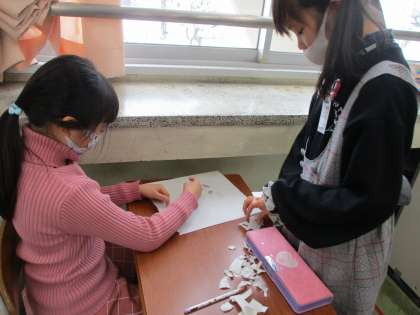 書き初め大会が終わった後に、福笑いで遊びました。友達同士で自分の作った顔を出し合い、完成した顔を見て楽しみました。