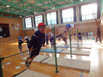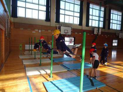 教頭先生から鉄棒の技を教えてもらいました。鉄棒に跳び上がり、足を振ってジャンプの距離や高さを友達と競い合いました。