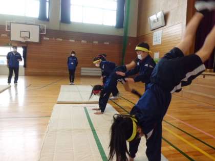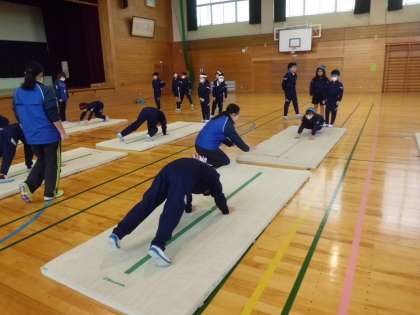 富山市スポーツ指導者派遣事業で、指導員の方々に前転、後転、側転(側方倒立回転)のやり方を指導していただきました。それぞれの技につながる基本の練習を、段階を追って教えていただくことで、みるみるうちに上達していきました。できない技ができるようになったり、よりきれいに技ができるようになったりし、次への意欲が高まりました。